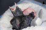 Corvid nestling and even young fledglings may need to be handled and encouraged to eat, at least initially. Most of the young birds may not gape, even when hungry, which means that these birds need to be hand fed. Hand feeding requires the rescuer to gently open the beak, and to place the food item into the mouth to induce the swallowing reflex. It may be useful, at least for an inexperienced person, to have a helper at hand, where one person holds the bird and the other is doing the feeding. It may also be useful to wrap the bird into a thin towel, especially when the bird is very mobile, which will immobilise the bird and protect the plumage. The food item needs to be placed very carefully deep into the throat, behind the clearly visible opening of the windpipe and without occluding it. This procedure will trigger the swallow reflex. Plastic tweezers may prove very useful to achieve exactly that. It may take a while for the bird to get the idea, but eventually young dependent bird will start gaping again. Older birds might dislike the idea of being fed, and will most certainly start eating by themselves. At the end of every feeding session, small droplets of fluid should be offered as described above, ideally enriched with multivitamins.