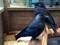 Hand raised corvids need to go into an outdoor aviary when they become of fledgling age, which is also the time when the weaning process starts. This process is usually done in an outdoor soft release aviary, where these birds whilst still being hand fed will also gradually learn how to forage by themselves.Every species is usually being kept in their own specifies specific aviary. However, juvenile carrion crows and rooks can be an exception. Both species are more often being kept together than apart, which is sometimes happening rather by accident due to difficulties in identifying the correct species. They usually get on well and can also be soft released together, assuming that the release aviary is located near an unoccupied crow territory. Ideally, juvenile crows should be released into a non-breeding flock of crows, and rooks into a flock of rooks. However, as this is not always possible, the soft release of juvenile crows can also be done safely near a flock of rooks or a rookery. We have frequently observed that these youngsters are staying with a flock of rooks until they feel confident enough to move on.