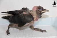 Kojak, a nestling jackdaw, has been brought to us after being found on the ground, for reasons unknown to us. He might have been the runt of the brood, thrown out of the nest by his own kind, but he was lucky enough to have been found and rescued by a very kind and compassionate person. However, we have also learned over the past weeks, where we had the privilege to care for him and to get to know each other, that being the runt doesn’t mean at all that the bird concerned doesn’t want to live. Kojak has got the spirit of a fighter, whilst also being a very gentle and loyal soul.